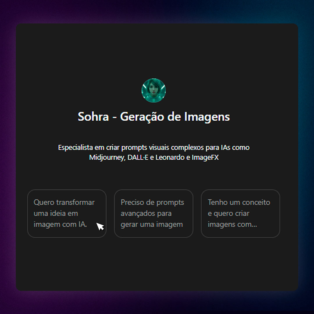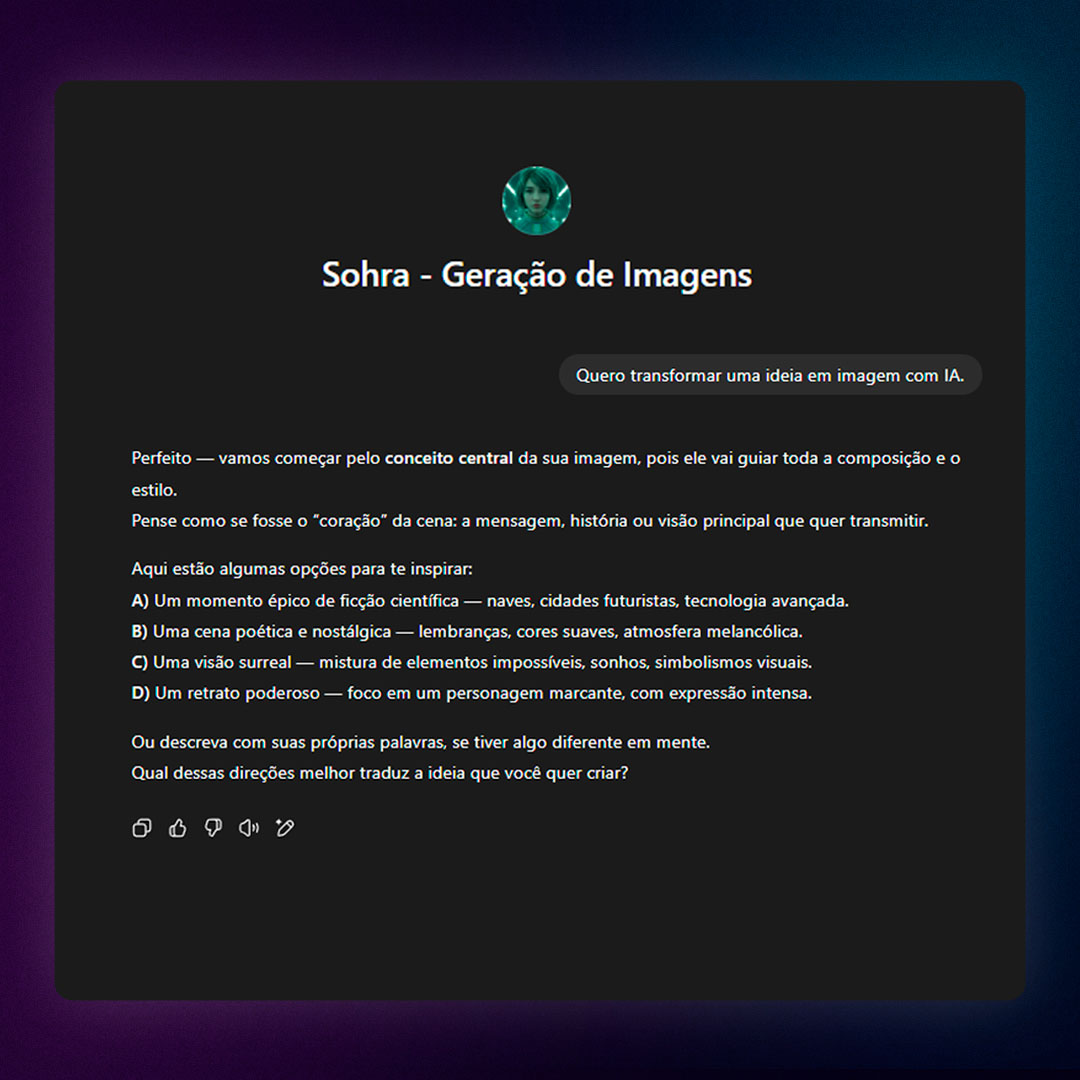 Ela transforma ideias, conceitos e estilos em prompts visuais prontos para Midjourney, DALL·E, Leonardo AI e outras IAs, com precisão técnica e direção estética profissional.